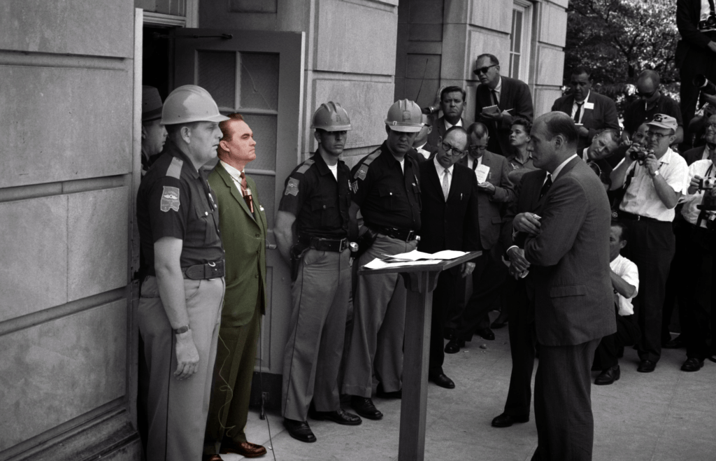 George Wallace, one of the most controversial politicians in U.S. history, was elected governor of Alabama in 1962 under an ultra-segregationist platform. In his 1963 inaugural address, he promised his white followers: “Segregation now! Segregation tomorrow! Segregation forever!” When African American students attempted to desegregate the University of Alabama in June 1963, Alabama’s new governor, flanked by state troopers, literally blocked the door of the enrollment office. The U.S. Supreme Court, however, had declared segregation unconstitutional in 1954’s Brown v. Board of Education, and the executive branch undertook aggressive tactics to enforce the ruling.
