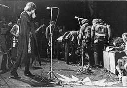 On December 6, 1969, in a shocking act of violence, a Hells Angel biker stabs to death an 18-year-old concertgoer during a set by the British rock group Rolling Stones at the Altamont music festival.